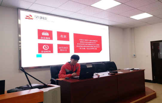 首先,党支部副书记胡刘磊讲述了党日活动流程和近期党建工作的安排,随后传达党的十九届四中全会重要内容,他简单介绍了十九届四中全会的背景和大致内容。